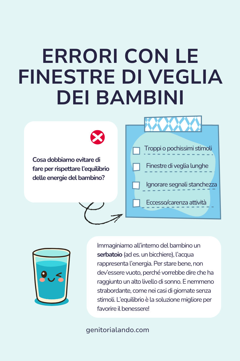 La finestra di veglia è invece il tempo massimo che il bambino può stare sveglio prima di diventare irrequieto o sovrastimolato.